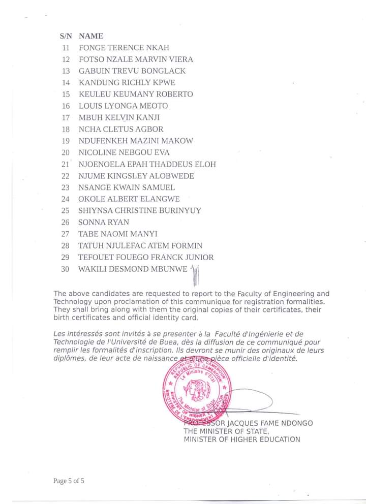 Portant publication des résultats du cocours d'entrée en premiere année Génie Civil de la Faculté d'Ingénierie et de Technologie de l'Université de Buea au titre de l'année académique 2020/2021