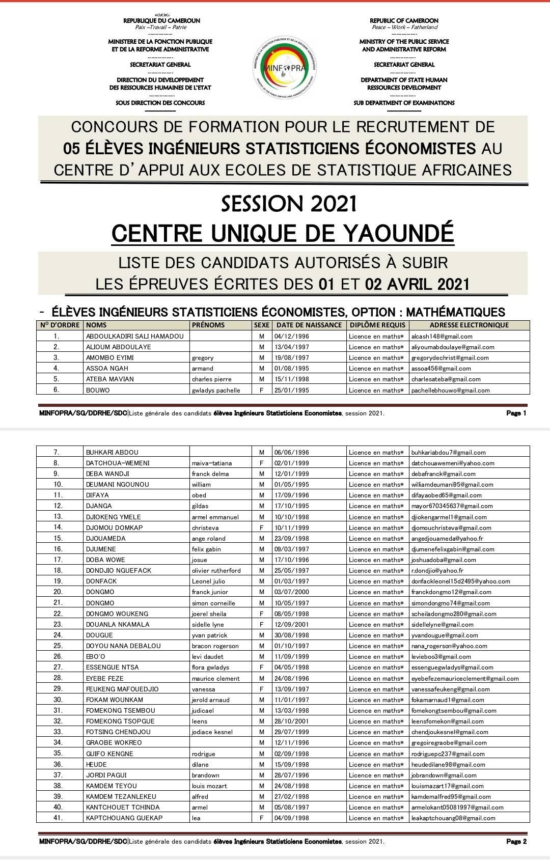 01, 02, 05 et 06 avril 2021 des concours de formation pour le recrutement des élèves Ingénieurs Statisticiens Économistes, Ingénieurs Statisticiens Économistes (ISE) Cycle Long et Analystes Statisticiens au Centre d'Appui aux Ecoles de Statistique Africaines (CAPESA), session 2021.