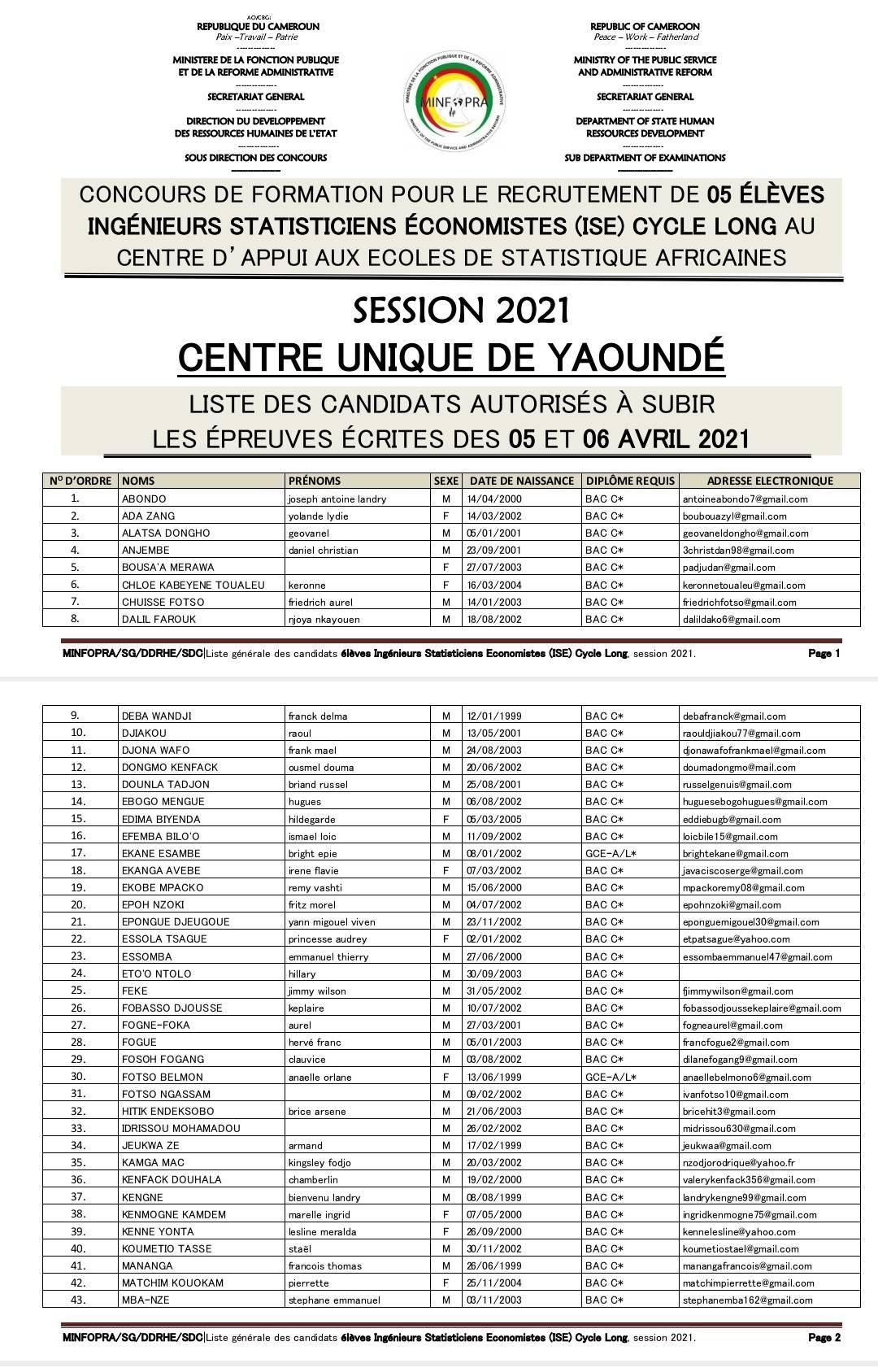 | Listes des candidats autorisés à subir les épreuves écrites pour le recrutement des élèves ISE Cycle Long et Analystes Statisticiens |