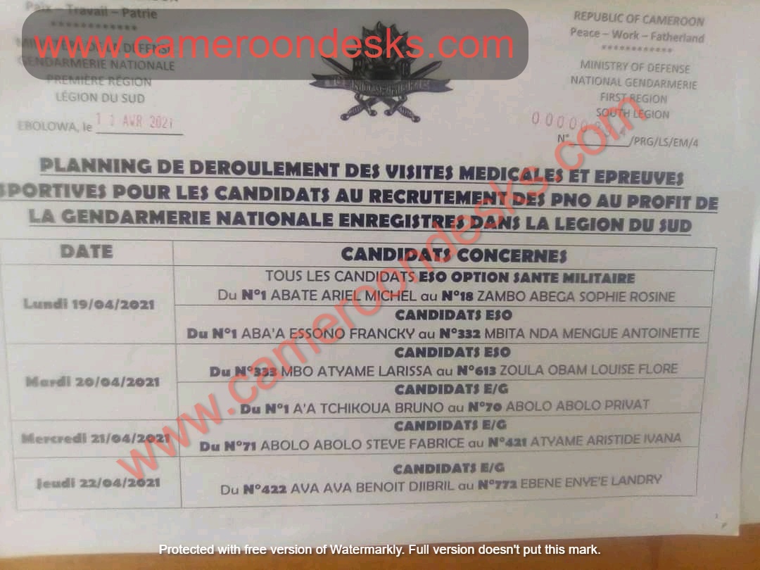 Planning de déroulement des visites médicales et épreuves sportives pour les candidats au recrutement des PNO au profit de la gendarmerie nationale enregistres dans la légion du Sud.