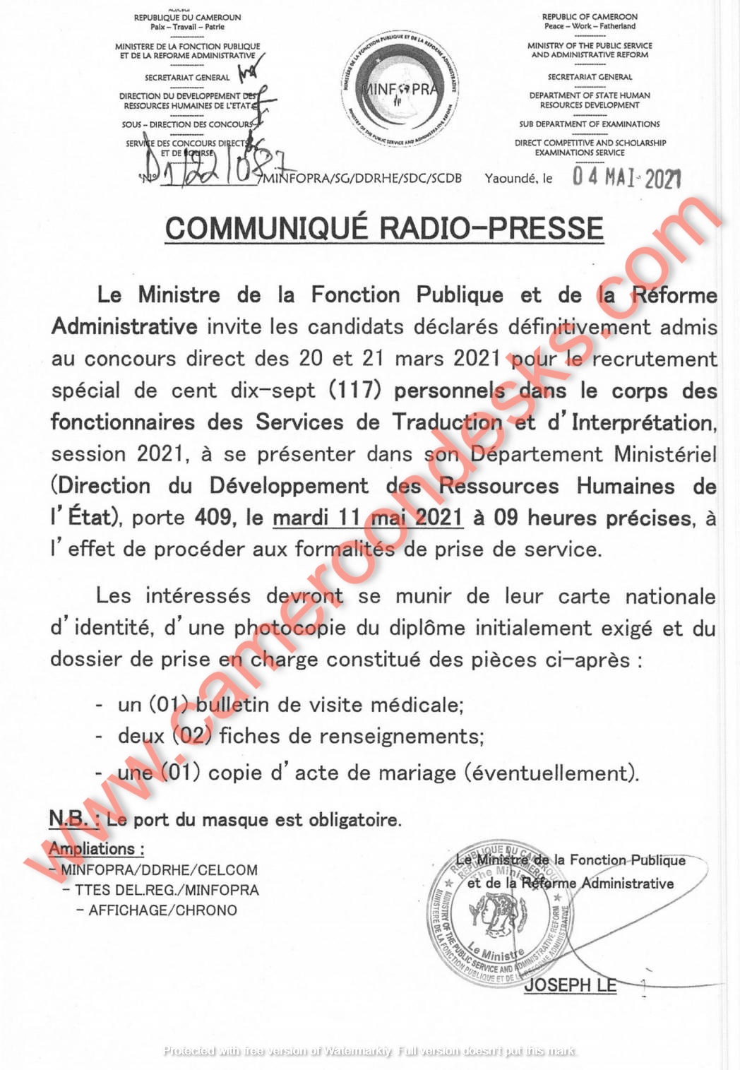 Communiqué radio-presse à l’attention des candidats déclarés définitivement admis au concours direct des 20 et 21 mars 2021 pour le recrutement spécial de 117 personnels dans le corps des fonctionnaires des services de traduction et d’interprétation, session 2021