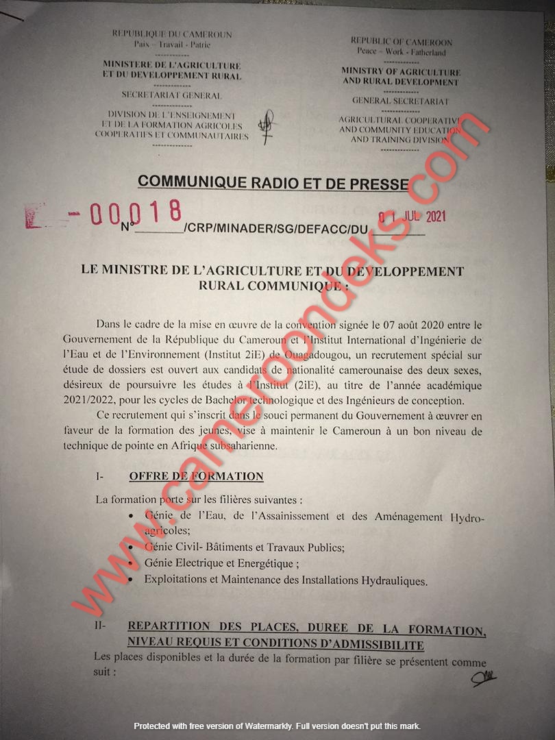 d'Ingénierie de l'Eau et de l'Environnement (Institut 2iE) de Ouagadougou, un recrutement spécial sur étude de dossiers est ouvert aux candidats de