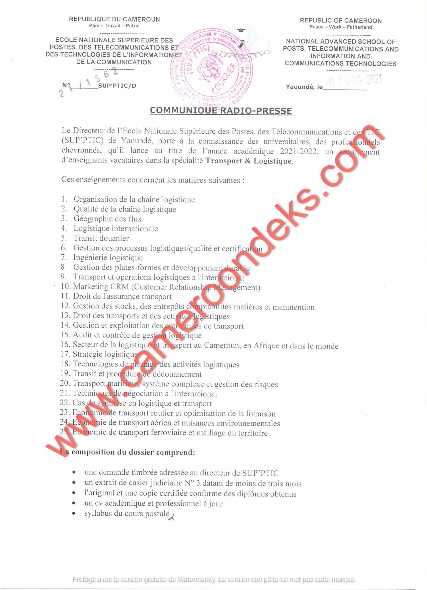 The Director of the Yaoundé National School of Posts, Telecommunications and ICTs (SUP'PTIC), wishes to inform academics and seasoned professionals in the field of Transport & Logistics that he is recruiting part-time lectures for the 2021/2022 academic year